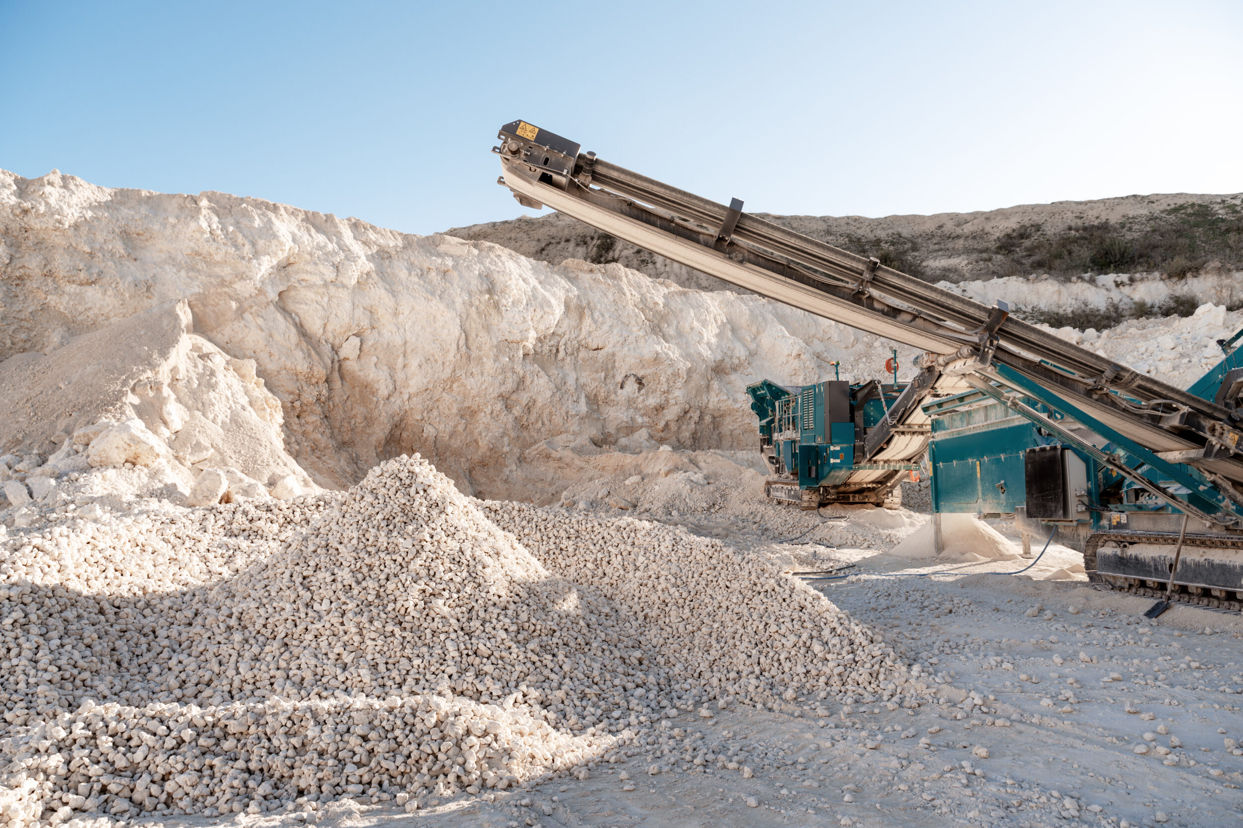 Eine große Maschine mit Förderband kippt Schotter auf einen wachsenden Steinhaufen. Im Hintergrund sind weitere Erdhügel und eine staubige Baustellenfläche zu sehen, die von warmem Sonnenlicht beleuchtet wird. Die Szene vermittelt den Eindruck einer aktiven Baustelle oder eines Steinbruchs.