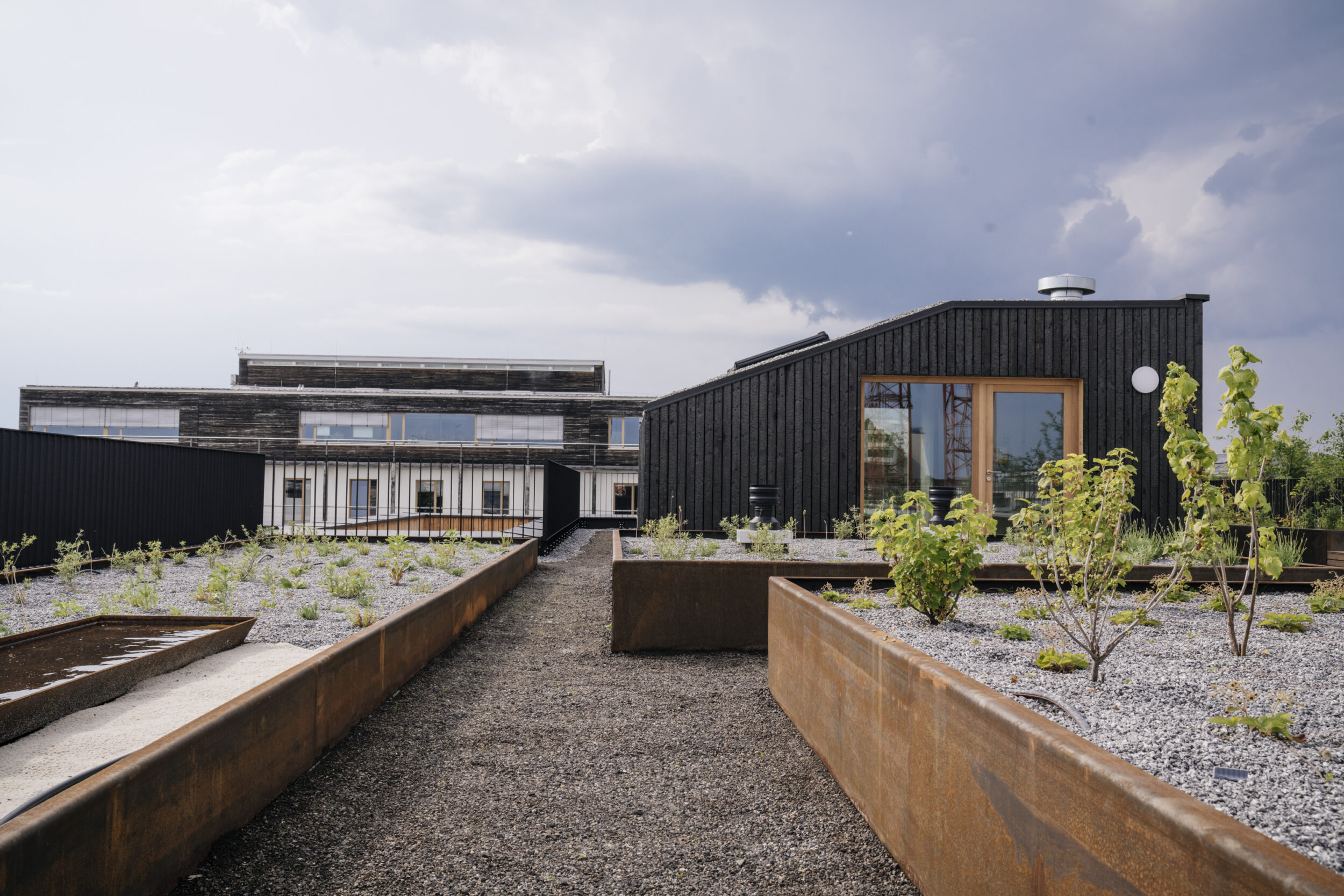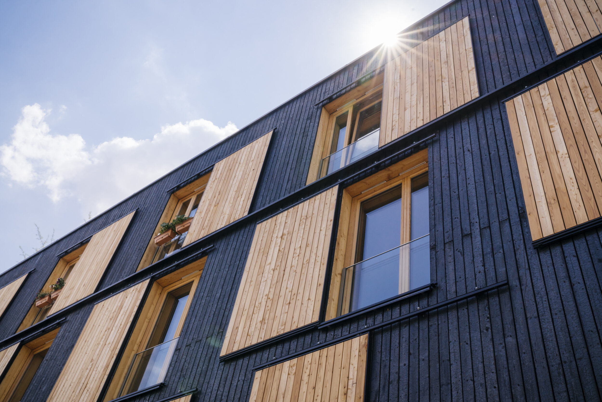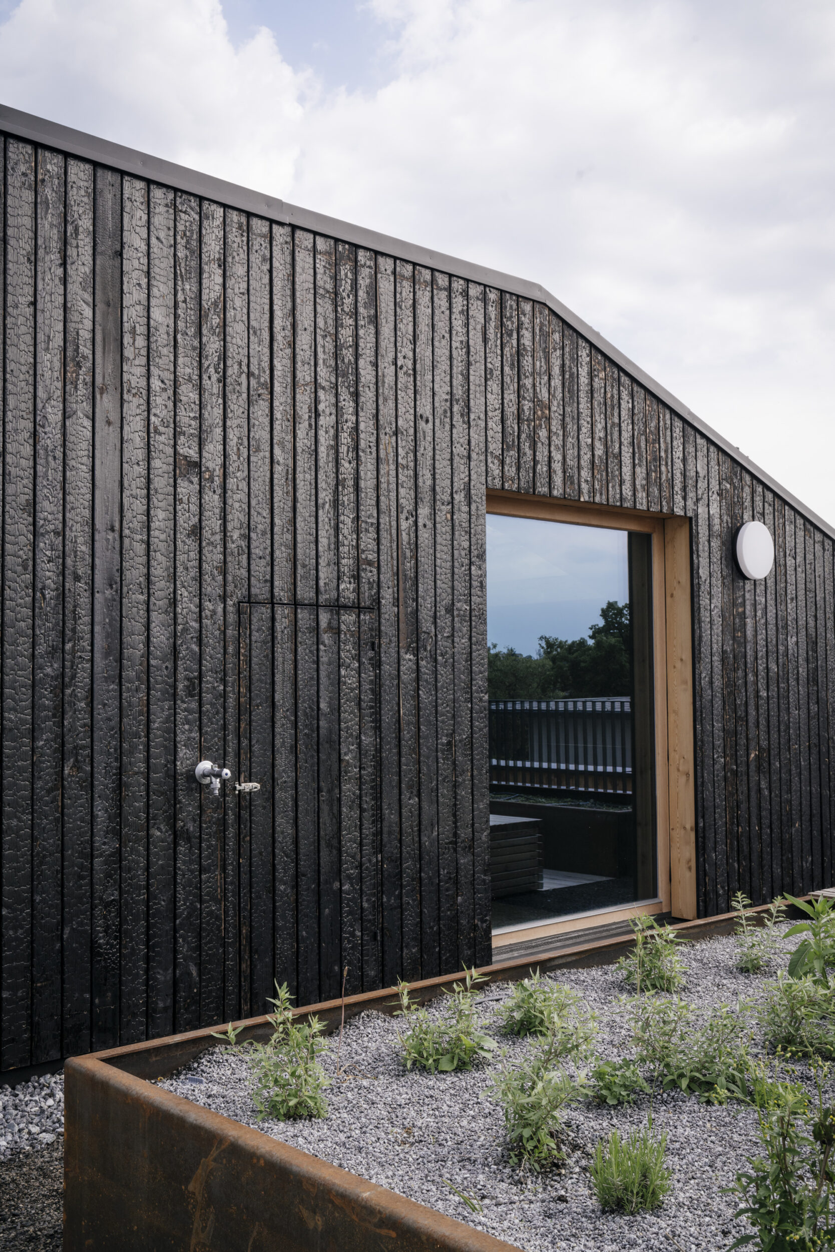 Die fast schwebend wirkenden Obergeschosse wurden mit einer karbonisierten Holzschalung aus heimischen Fichtenholz verkleidet. Die Technik des Verkohlens der Holzoberfläche hat ihren Ursprung in Japan. Durch das kontrollierte Beflammen des Holzes wird dessen Zellstruktur so verändert, dass ein beständiger und natürlicher Schutz vor Wasser, Schimmel, Fäulnis und Insekten entsteht.