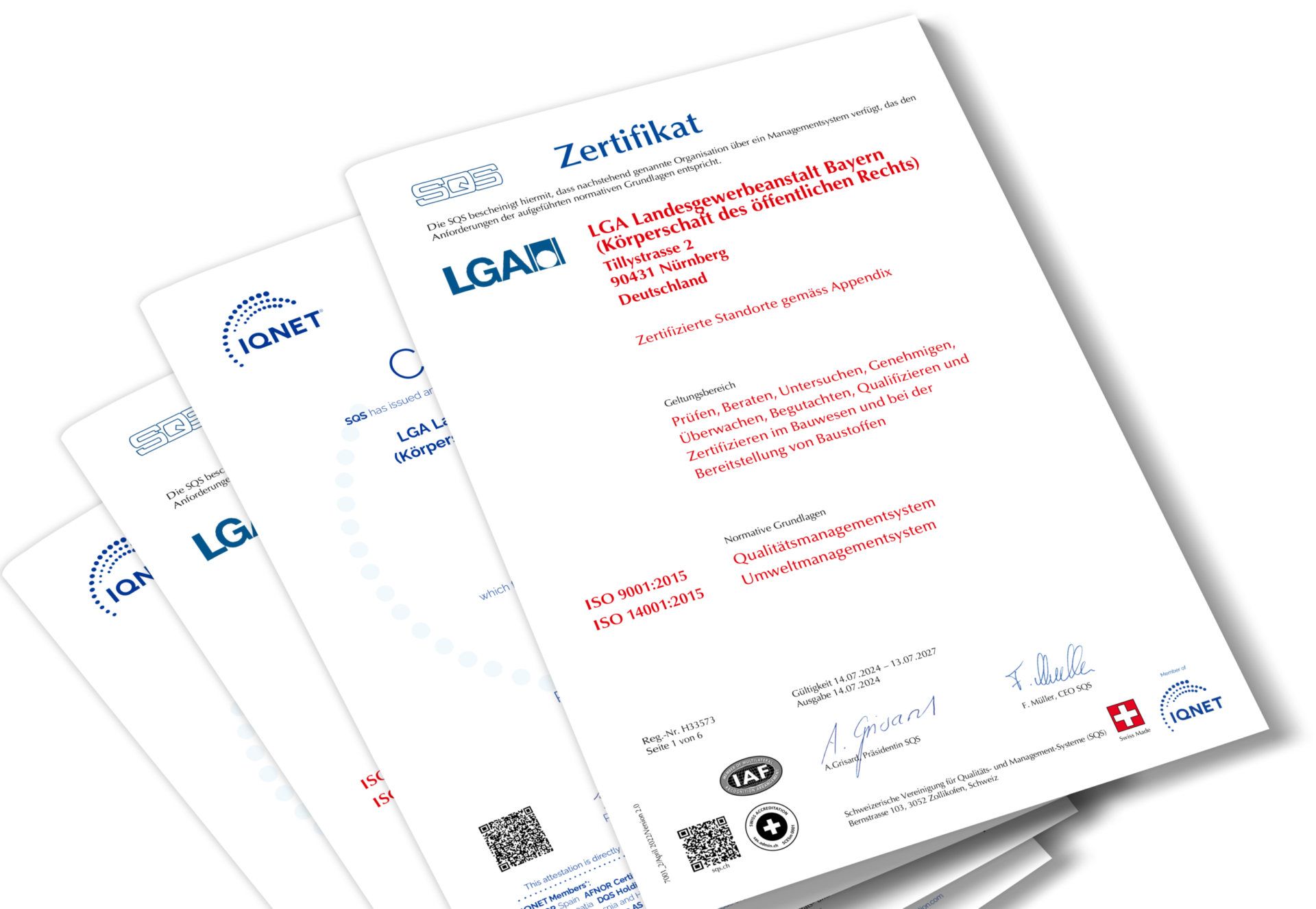 Die LGA Landesgewerbeanstalt Bayern und die LGA Bautechnik GmbH verfügen über ein integriertes Managementsystem, das die zertifizierten Bereiche Qualitätsmanagement nach ISO 9001 und Umweltmanagement nach ISO 14001 umfasst, sowie die Bereiche Arbeits-, Gesundheits- und Datenschutz sowe Risiko- und Energiemanagement. Permanentes Ziel des Managementsystems sind die kontinuierliche Verbesserung unserer Dienstleistungen und die Erhöhung der Kundenzufriedenheit.
