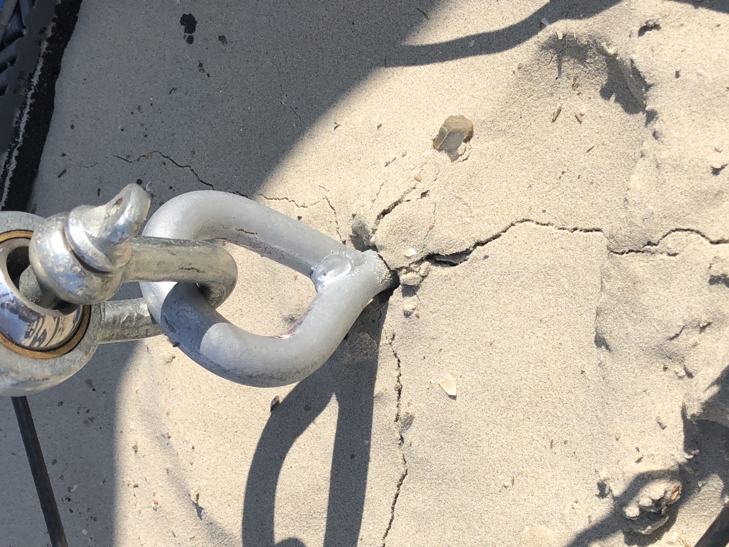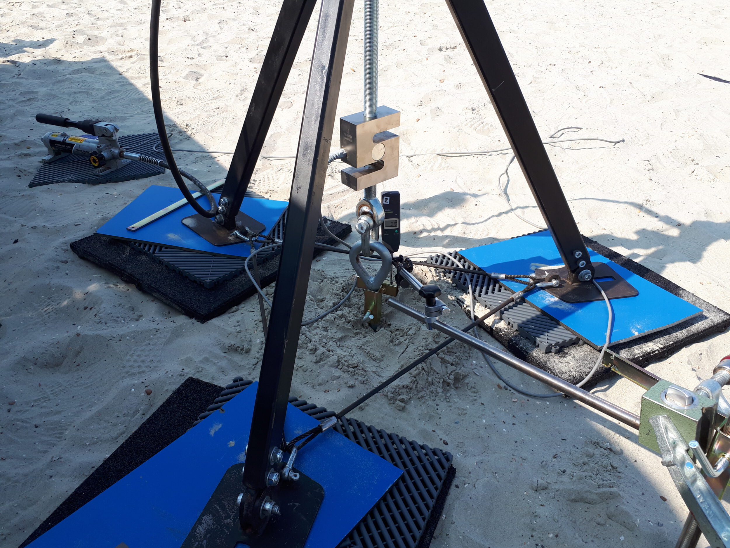„Das war natürlich eine Herausforderung, die war spannend und reizvoll“, so der Nürnberger Bauingenieur mit einem verschmitzten Lächeln. Kurzfristig fuhr er mit einem fertigen Prüfkonzept nach Borkum. Herr Best von der Fa. IGEL kam mit geeigneten Schraubankern und der Belastungseinrichtung dazu. Begemann, Best und Müllner drehten nun die Erdschraubanker (bestehend aus einer Eisenstange mit einer Öse sowie einem Teller mit Gewindegang) in den Sand ein. In Anlehnung an die DIN EN 1997-2 mussten die Schraubanker die 1,8-fache Gebrauchslast, also 1,8 Tonnen im Versuch aushalten. Diese Belastung haben die Schraubanker bei den Probebelastungen einwandfrei abtragen können.