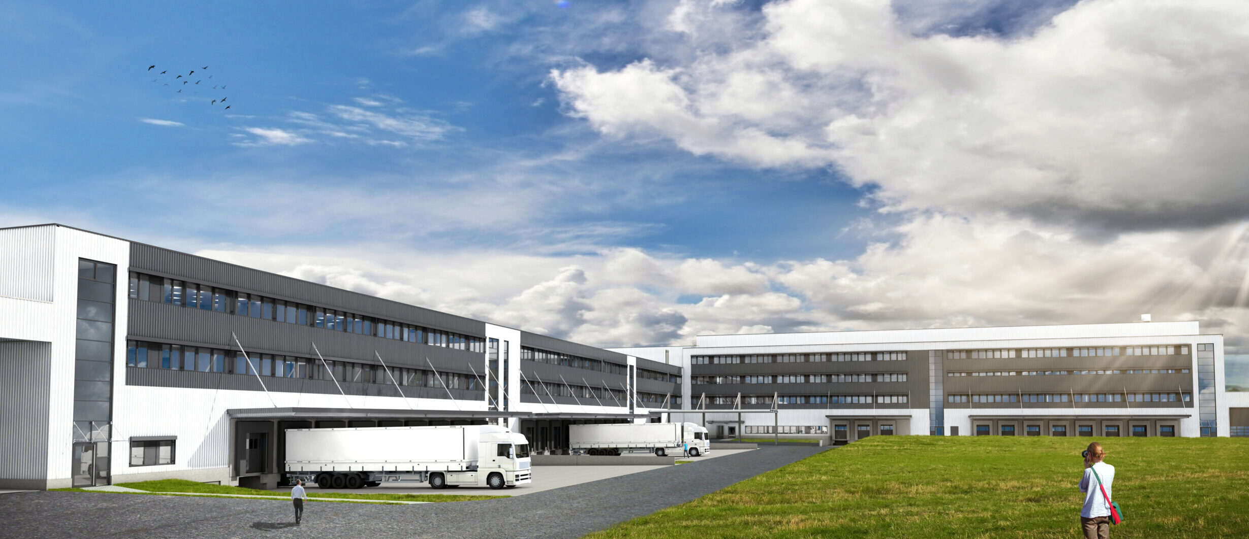 Das Bild zeigt einen großen Industrie- oder Gewerbebau mit mehreren Laderampen, an denen weiße Lastwagen geparkt sind. Das Gebäude hat mehrere Etagen mit vielen Fenstern. Im Vordergrund befindet sich eine Grasfläche, auf der zwei Personen spazieren gehen.