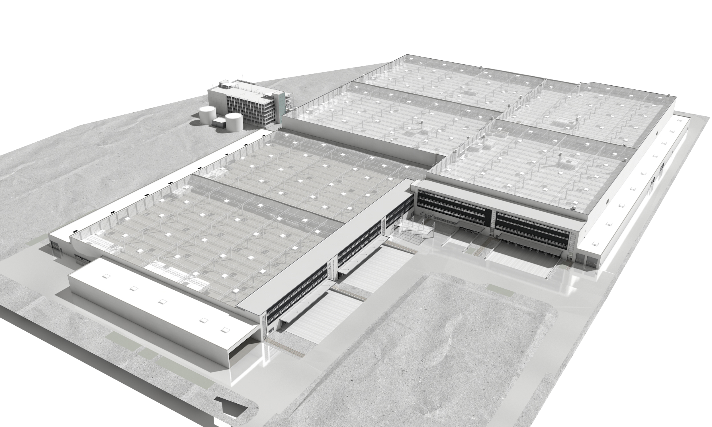 Das neue Logistikzentrum besteht aus sechs geschlossenen, miteinander verbundenen, nur durch Brandwände separierte Hallen, mehreren offenen, überdachten Bereichen und einem alleinstehendem Parkhaus, das über eine Fußgängerbrücke und einen Skywalk erreichbar ist. Der Hallenkomplex misst im Grundriss ca. 380 m x 240 m. Die sechs Hallen der Logistikanlage zusammen erstrecken sich über eine Nutzfl äche von rund 120.000 qm. Die Hallen 1 und 2 bzw. 5 und 6 wurden nachträglich zweigeschossig geplant, um die erforderliche Größe für den Mieter Audi und VW, die hier zwei Logistikgewerke mit insgesamt 700 Mitarbeitern zusammenlegen wollen, zu gewährleisten.