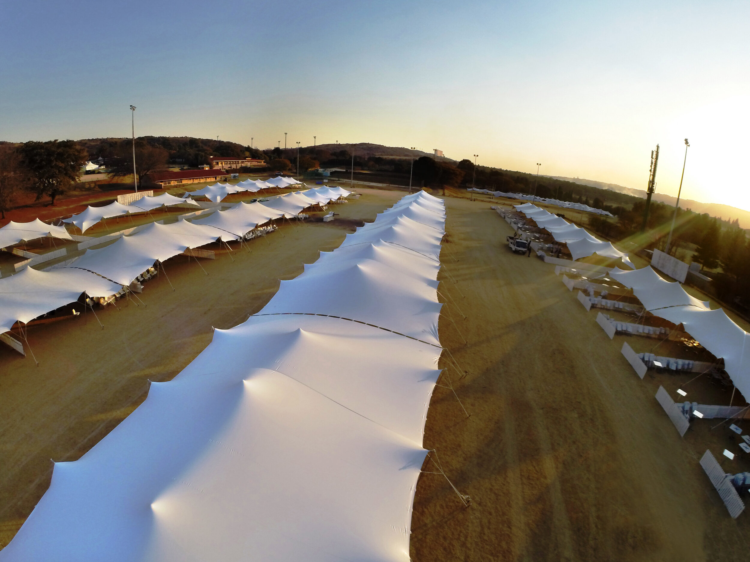 „Hochwertige Stretchzelte“, so benennt beispielsweise der südafrikanische Hersteller Nomadik Tents seine Produkte, die durchaus strukturelle Ähnlichkeiten mit den historischen Vorläufern besitzen. Seit 2002 beliefert die Firma, deren Hauptsitz in Johannesburg ist, Kunden in aller Welt. Inzwischen gibt es zahlreiche Niederlassungen, unter anderem in Europa. Filz hat als Baustoff ausgedient, doch naturgemäß sind die Stoffe für die hochmodernen, leichtgewichtigen Bauten eines der entscheidenden Qualitätskriterien: Eigens für Nomadenzel te geliefertes „Contour-beschichtetes Gewebe“ wird je nach Zweck für nicht selten maßgeschneiderte Zeltbauten verwendet. Längst haben Ultraschall– Schweiß-technologien herkömmliche Nähmethoden ersetzt. Nicht immer dienen diese Zelte zeitlich begrenzten Zwecken. In Gärten, an Pools oder historischen Bauten können sie, farblich angepasst oder auffallend dekorativ auch langfristige Aufgaben erfüllen. Die Lebensdauer geben die Produzenten der Zelte mit etwa zehn Jahren an. Im Rahmen der LGA Prüfregularien aber gelten sie als „Fliegende Bauten“. Ein Blick in die Galerie der Hersteller offenbart die Vielfalt der Einsatzmöglichkeiten: Vom kleinen Sonnenschutz über einem Pool oder einer Terrasse bis zur eigens errichteten Zeltstadt inmitten einer Einöde ist nahezu alles denkbar. Flexible Messebauten, ganze Märkte, stylische Party-Lounges, Vorbauten für Hotels oder Kongresshallen, der Mittelpunkt einer Strandanlage oder Ort einer Hochzeit oder eines Firmenjubiläums – der Einsatz der flexiblen Bauten ist schier unendlich. In Coronazeiten besonders nützlich sind offene Strukturen ohne Seitenwände, die Witterungsschutz bieten, aber Luft zirkulieren lassen.