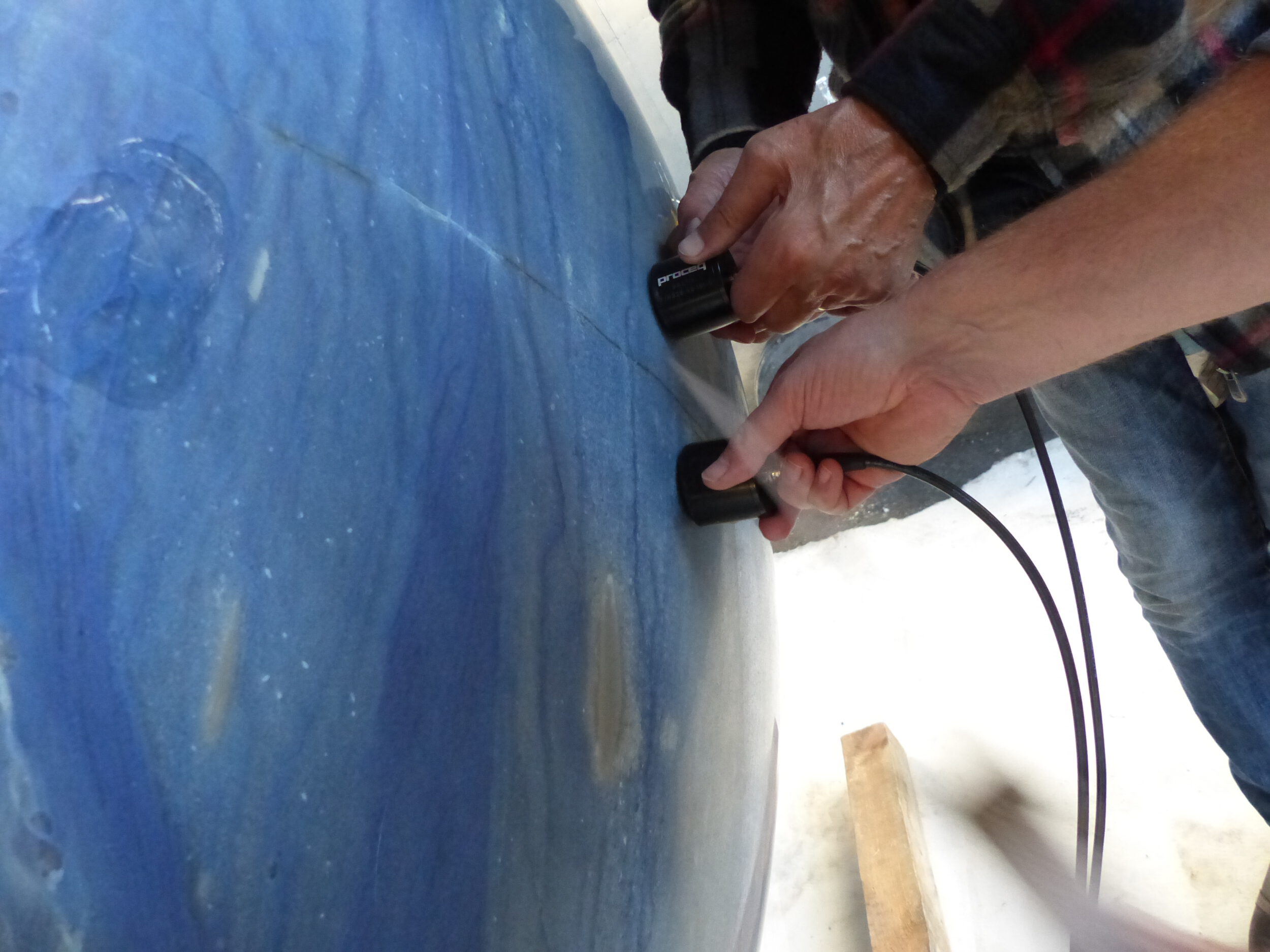 „Eine Kluft“, Gregor Stolarski von der LGA zeigt auf eine dunklere Linie, die über eine kleine Macaubakugel verläuft, „heißt erstmal nichts. Das muss keine Stelle sein, wo der Stein leichter bricht.“ Bevor Stolarski ins Spiel kam, hatte die bundesweit renommierte Expertin für das zerstörungsfreie Messen von Materialien Dr.-Ing. Gabriele Patitz aus Karlsruhe den Auftrag bereits einmal abgelehnt: „Der Quader ist einfach zu groß, so tief können wir mit unseren hochfrequenten Radarsensoren nicht messen“, musste sie einräumen. Doch dann erinnerte sie sich an die bewährte Zusammenarbeit mit Gregor Stolarski und ihren langjährigen Partner, den Geophysiker Markus Hübner.