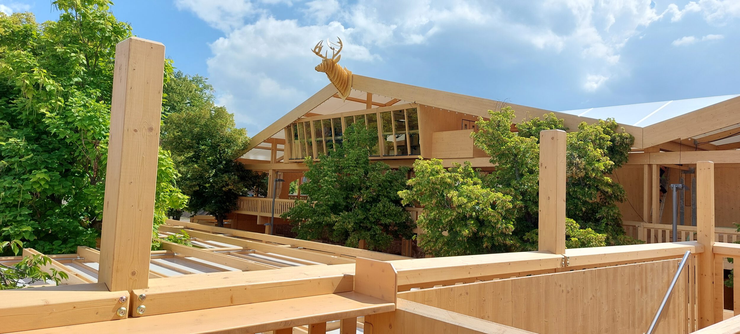 Bis ins Detail sind alle sichtbaren Teile dieses riesigen Baus, Lounges, Treppenanlagen, Galerien in Modulbauweise aus Holz gefertigt, sogar die Regenrinnen in den Kehlen. Das Zentrum des offenen Biergartens bildet der zweistöckige Ausschank- und Barbereich, überdacht mit einer Faltmarkise aus Zeltplane. „Die besondere Herausforderung für den Tragwerksplaner“, so Jürgen Lehnert von der LGA, „bestand darin, die erforderlichen lösbaren Verbindungen für den Fliegenden Bau einerseits zu berechnen und andererseits als verdeckte oder kaum sichtbare Anschlüsse zu gestalten; insbesondere die Ausführung als biegesteife Rahmenecken sind an dieser Stelle zu erwähnen. Diese Kombination gibt es im üblichen Holzbau sonst nicht.“ Das Referat Fliegende Bauten war idealerweise als Prüf- und Genehmigungsstelle von Anfang an in das Projekt eingebunden und baubegleitend tätig.