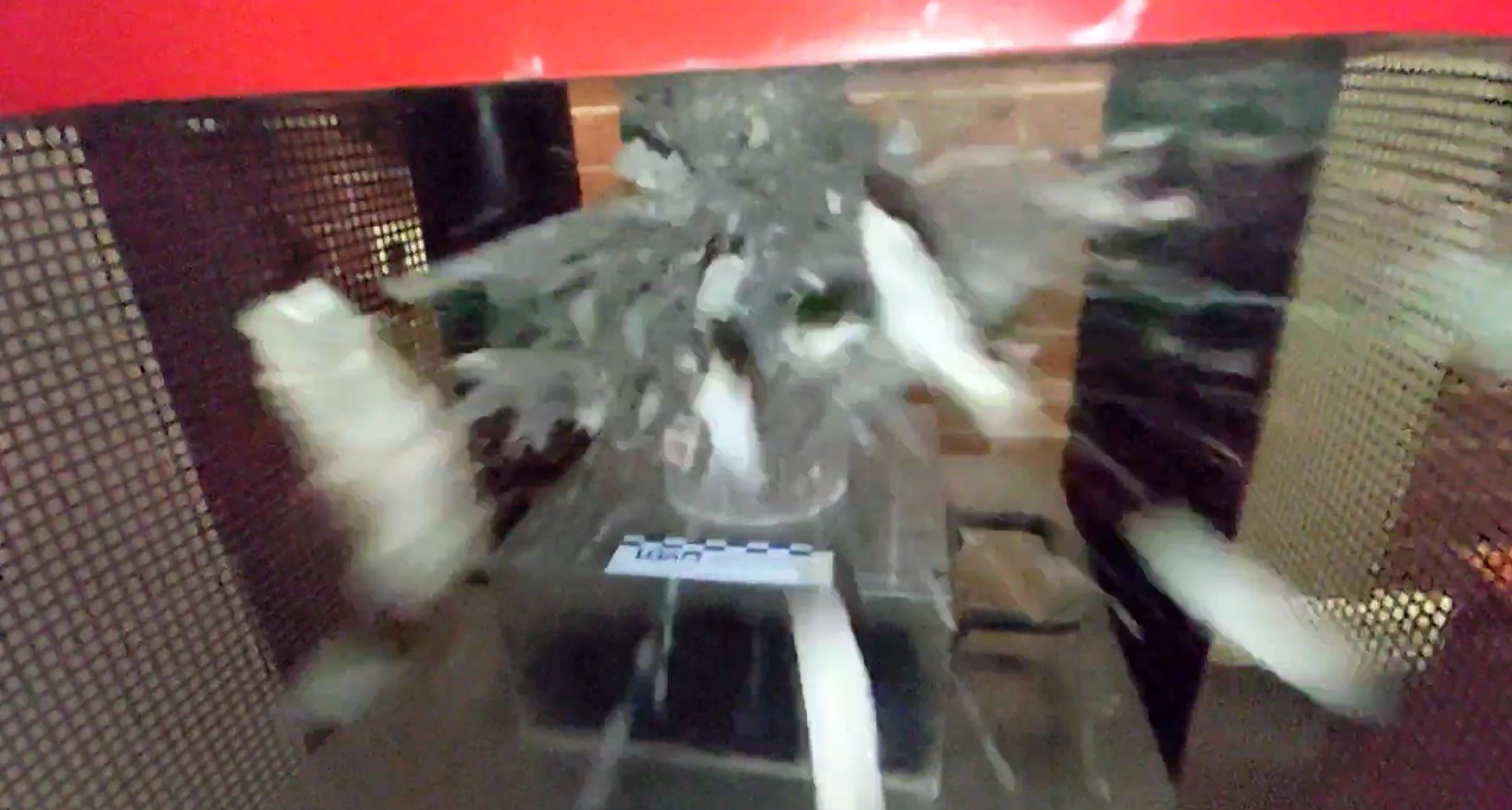 Bei normalem Beton zeigt ein Körper an, dass er zerbrechen wird, indem er Risse bekommt. Hochfester Beton reagiert lange nicht sichtbar auf den Druck, bis zu dem Augenblick, in dem er birst. Die Prüfpresse steht im LGA-Labor auf einer dicken Stahlplatte, der Raum ist durch ein Gitter geschützt. Lange läuft der Versuch – und man sieht keine Veränderung, während der Druck auf den Betonzylinder immer größer wird. Dann – urplötzlich – zerbirst der Prüfkörper in tausende Teile, die mit großer Geschwindigkeit auseinanderspritzen und durch das Gitter abgehalten werden. Es staubt und rumst und das Ergebnis wird den Kunden freuen: Bei 150 N/mm² hat der „Knall“ stattgefunden, der Sollwert wurde überschritten.