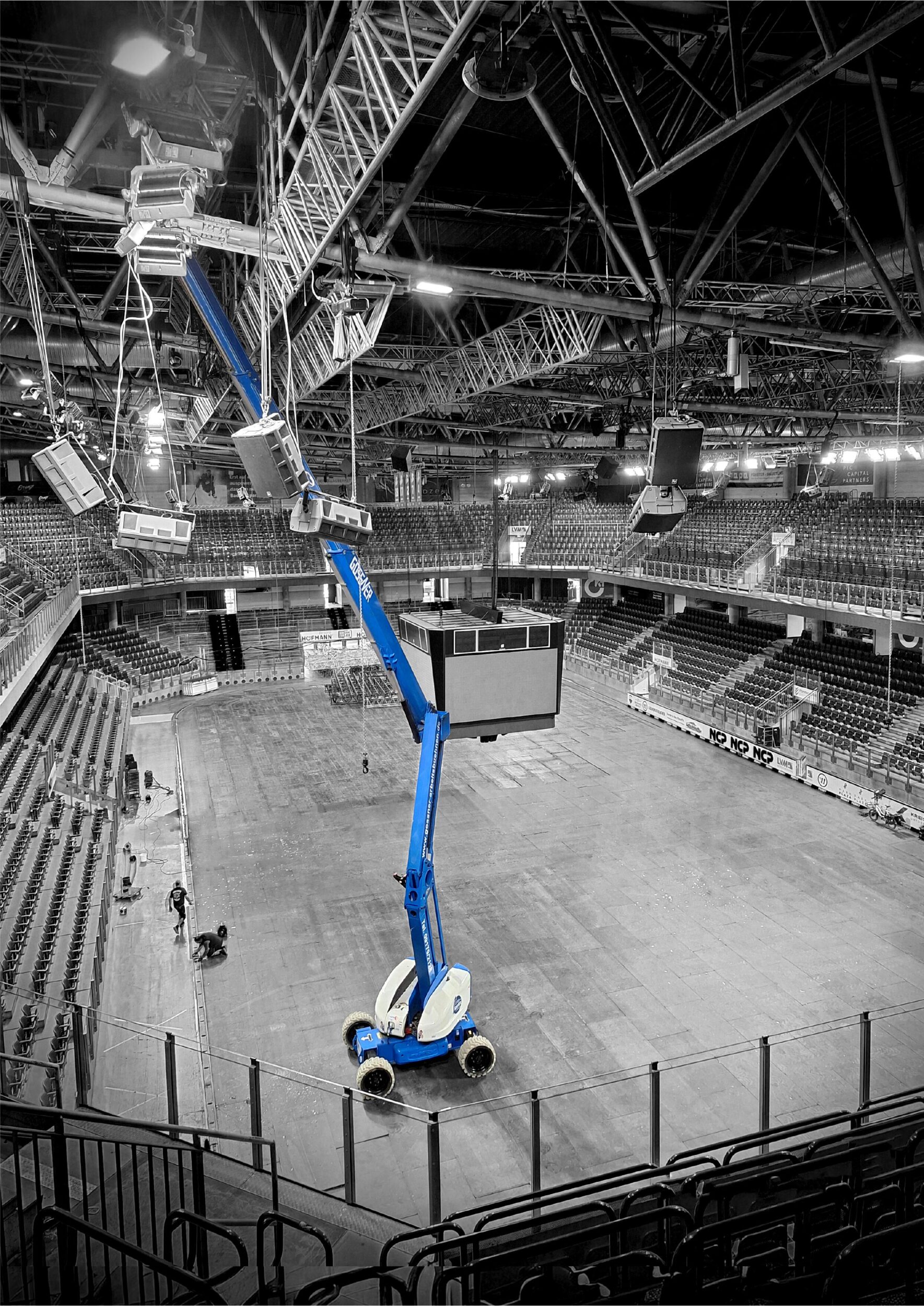 Für diese eingehende Prüfung muss der zuständige Bauingenieur nicht nur langjährige Erfahrung besitzen. Der Prüfgegenstand, die Dachkonstruktion der Veranstaltungshalle, befindet sich in gut 20 Metern Höhe. Wer diese Dachkonstruktion eingehend unter die Lupe nehmen will, muss klettern können, schwindelfrei sein und auf engem Raum bei Temperaturen über 30 Grad stundenlang agieren können, kurz: über besondere Fitness verfügen. LGA-Ingenieur Stefan Braml konnte die Anstrengungen anschließend am eigenen Körper „vermessen“: „Fünfeinhalb Kilo Gewichtsabnahme in zwei Wochen“, sagt er lächelnd. Mit im Team LGA. Ein Laborant, der die Hubarbeitsbühne bediente, und Bramls Ingenieur- Kollege Peter Podlech.